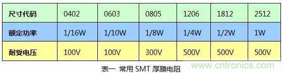 同样,耐压值选择不合适的情况下,也会因为电阻被击穿而导致系统设计的失败。举个例子:AC-DC开关电源??樵谏杓频氖淙肭岸耍莅补?GB4943.1标准的要求,在保证插头或连接器断开后,在输入端L、N上的滞留电压在1S之内衰减到初始值的37%,因此,在设计时一般会采用并接一个 或两个MΩ级阻抗的电阻进行能量泄放,而输入端是高压,即电阻两端是要承受高压的,当电阻的耐压值低压输入端高压的情况下,就会产生失效。以下表一是常见SMT厚膜电阻的参数,最终选型时还要和选购器件的厂家核实。