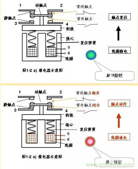 中间继电器就是个继电器,都是由固定铁芯、动铁芯、弹簧、动触点、静触点、线圈、接线端子和外壳组成。线圈通电,动铁芯在电磁力作用下动作吸合,带动动触点动作,使常闭触点分开,??サ惚蘸?线圈断电,动铁芯在弹簧的作用下带动动触点复位。