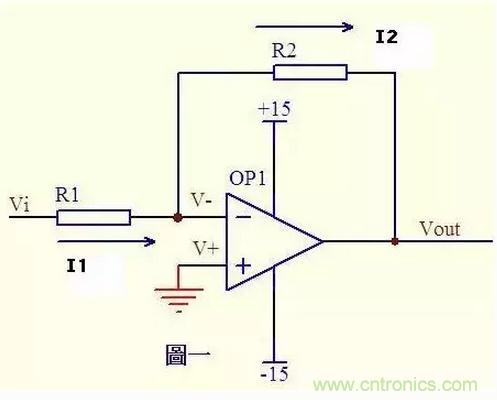 图一运放的同向端接地=0V,反向端和同向端虚短,所以也是0V,反向输入端输入电阻很高,虚断,几乎没有电流注入和流出,那么R1和R2相当于是串联的,流过一个串联电路中的每一只组件的电流是相同的,即流过R1的电流和流过R2的电流是相同的。 流过R1的电流I1 = (Vi - V-)/R1 ……a 流过R2的电流I2 = (V- - Vout)/R2 ……b V- = V+ = 0 ……c I1 = I2 ……d 求解上面的初中代数方程得Vout = (-R2/R1)*Vi 这就是传说中的反向放大器的输入输出关系式了。