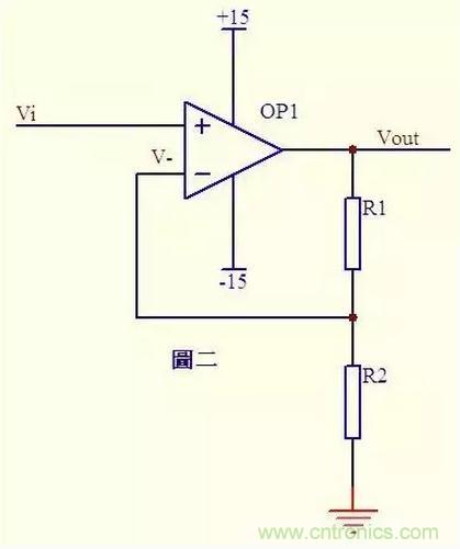 图二中Vi与V-虚短,则 Vi = V- ……a 因为虚断,反向输入端没有电流输入输出,通过R1和R2 的电流相等,设此电流为I,由欧姆定律得: I = Vout/(R1+R2) ……b Vi等于R2上的分压, 即:Vi = I*R2 ……c 由abc式得Vout=Vi*(R1+R2)/R2 这就是传说中的同向放大器的公式了。