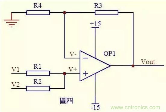 请看图四。因为虚断,运放同向端没有电流流过,则流过R1和R2的电流相等,同理流过R4和R3的电流也相等。故 (V1 – V+)/R1 = (V+ - V2)/R2 ……a (Vout – V-)/R3 = V-/R4 ……b 由虚短知: V+ = V- ……c 如果R1=R2,R3=R4,则由以上式子可以推导出 V+ = (V1 + V2)/2 V- = Vout/2 故 Vout = V1 + V2 也是一个加法器。