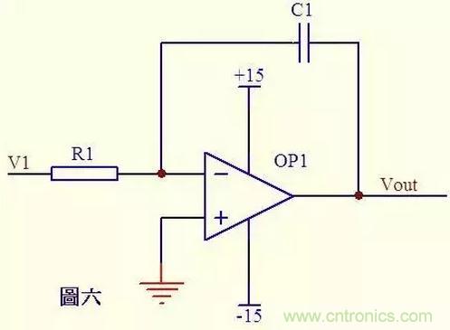 图六电路中,由虚短知,反向输入端的电压与同向端相等,由虚断知,通过R1的电流与通过C1的电流相等。 通过R1的电流 i=V1/R1 通过C1的电流i=C*dUc/dt=-C*dVout/dt 所以 Vout=((-1/(R1*C1))∫V1dt 输出电压与输入电压对时间的积分成正比,这就是传说中的积分电路了。 若V1为恒定电压U,则上式变换为Vout = -U*t/(R1*C1) t 是时间,则Vout输出电压是一条从0至负电源电压按时间变化的直线。
