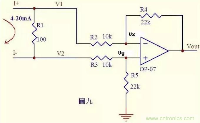 分析一个大家接触得较多的电路。很多控制器接受来自各种检测仪表的0~20mA或4~20mA电流,电路将此电流转换成电压后再送ADC转换成数字信号,图九就是这样一个典型电路。如图4~20mA电流流过采样100Ω电阻R1,在R1上会产生0.4~2V的电压差。由虚断知,运放输入端没有电流流过,则流过R3和R5的电流相等,流过R2和R4的电流相等。 故: (V2-Vy)/R3 = Vy/R5 ……a (V1-Vx)/R2 = (Vx-Vout)/R4 ……b 由虚短知: Vx = Vy ……c 电流从0~20mA变化,则V1 = V2 + (0.4~2) ……d 由cd式代入b式得(V2 + (0.4~2)-Vy)/R2 = (Vy-Vout)/R4 ……e 如果R3=R2,R4=R5,则由e-a得Vout = -(0.4~2)R4/R2 ……f 图九中R4/R2=22k/10k=2.2,则f式Vout = -(0.88~4.4)V,即是说,将4~20mA电流转换成了-0.88 ~ -4.4V电压,此电压可以送ADC去处理。