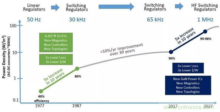 功率密度(AC-DC转换器~300W);线性调节器;开关调节器;高频开关调节器;新磁性元件;新控制器;新拓扑结构;2倍低损耗;3倍低成本/W;10年5倍提升;超过30年每年<10%改善;十年5倍提升;新GaN功率IC;效率。