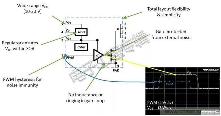 宽范围Vcc;调节器可保护SOA内的VGS;滞后的PWM可抗噪声干扰;整体布局灵活简洁;栅极可防止外部噪声。
