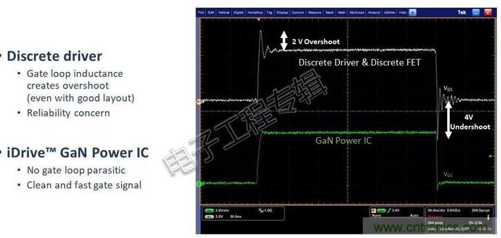 没有栅极阻抗或电阻的分立解决方案会产生不稳定的电路。 如果添加了阻抗,它会变得稳定,但也会导致很长的开关周期。 因此,如果可以直接连接驱动器输出和栅极输入,那么就可以快速运行并保持稳定。压摆率只需要一个电阻即可搞定。 因此,集成意味着一种非常可控的高性能器件。