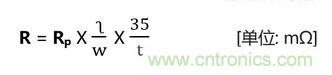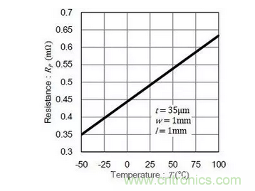 此外,如果知道每单位面积铜的电阻值Rp在不同温度下的变化(如下图资料所示),可以使用以下公式估算整个铜的电阻值R。注意下图铜的尺寸是:厚度(t)35μm,宽度(w)1mm,长度(?)1mm。