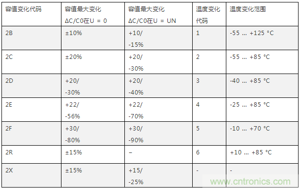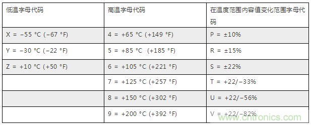 举个列子,一个代码为Z5U的电容工作温度范围为+10°C 到 +85 °C,容差为+22% 到 -56%;一个X7R的电容的工作温度为-55°C 到 +125 °C,容差为±15%。
