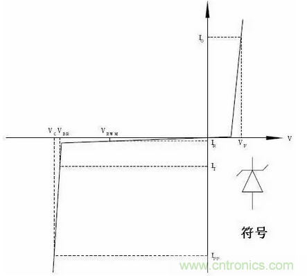 器件在发生击穿的区域内,在规定的试验电流I(BR)下,测得器件两端的电压称为击穿电压,在此区域内,二极管成为低阻抗的通路。