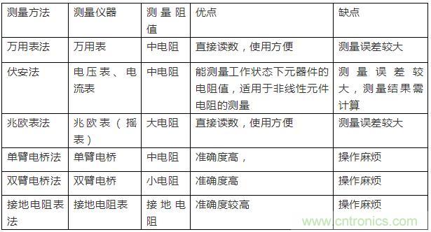 按所使用的仪表分类分为:万用表法、伏安法、兆欧表法、单臂电桥法、双臂电桥法、接地电阻表法等。
