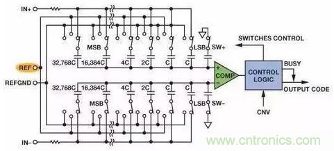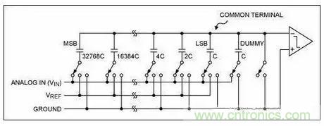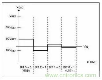 每个时钟沿,比较器对电容上的电压和地作比较, 由此结果来决定下一个电容是否接入电路。