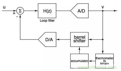 基本思想是快速遍历DAC中的每一个电流元从而减少电流元mismatch对ADC信噪比的影响,仅仅通过几个简单的数电??榫褪迪侄缘缌髟猰ismatch的first order noise shaping,非常巧妙。