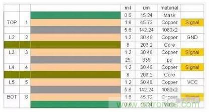 当制作某一特定厚度的印制板时,一方面要求合理地选择各种材料的参数,另一方面,半固化片最终成型厚度也会比初始厚度小一些。下面是一个典型的6层板叠层结构: