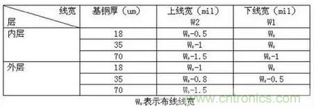 我们会以为导线的横截面是一个矩形,但实际上却是一个梯形。以TOP层为例,当铜箔厚度为1OZ时,梯形的上底边比下底边短1MIL。比如线宽5MIL,那么其上底边约4MIL,下底边5MIL。上下底边的差异和铜厚有关,下表是不同情况下梯形上下底的关系。