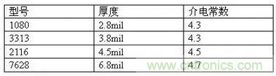 介电常数:半固化片的介电常数与厚度有关,下表为不同型号的半固化片厚度和介电常数参数: