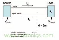 图1:电路回路中的共模电流。电路中的源是一个数字信号(带谐波),其负载被假定为阻性。因为远端导线上的相电流和近端导线上的相电流的流向是相同的,所以其合成相量相较于差模电流产生的相量会更大。在这种情况下,为了限制辐射发射的水平,降低谐波成分的大?。趼中藕诺纳仙?下降时间)或者转移/限制共模电流是非常重要的。