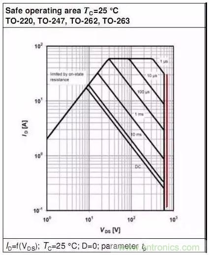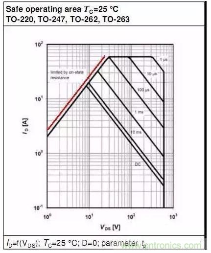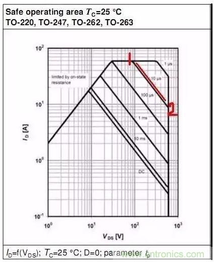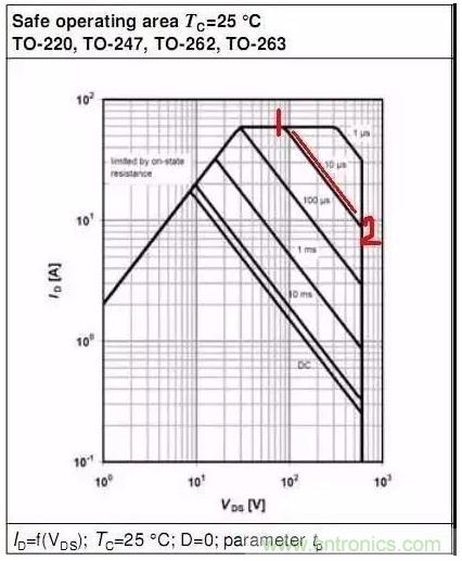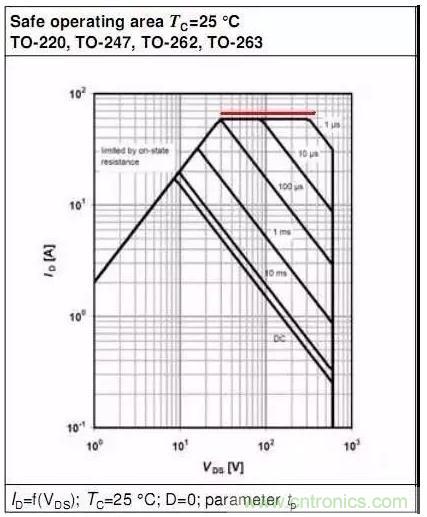 此图中:当VDS=1V时,Y轴对应的ID为2A,Rds=VDS/ID=0.5R ==>Tj=150℃时,Rds(on)约为0.5R.当VDS=10V时,Y轴对应的ID为20A,Rds=VDS/ID=0.5R ==>Tj=150℃时,Rds(on)约为0.5R.所以,此部分曲线中,SOA表现为Tj_max时RDS(on)的限制.