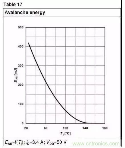 计算出来EAS后,对比datasheet上的EAS值,若在datasheet的范围内,则可认为是安全的(当然前提是雪崩电流<IAR)同时,还得注意,EAS随结温的增加是减小的,如下图: