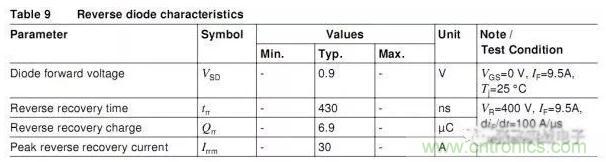 VSD,二极管正向压降 ==>这个参数不是关注的重点,trr,二极管反向回复时间 ==>越小越好,Qrr,反向恢复电荷 ==>Qrr大小关系到MOSFET的开关损耗,越小越好,trr越小此值也会小