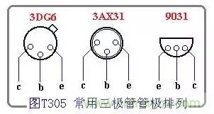 常用中小功率三极管有金属圆壳和塑料封装(半柱型)等外型,图T305介绍了三种典型的外形和管极排列方式。