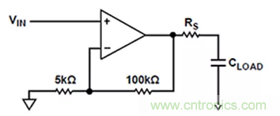 为解决这一问题,运算放大器设计人员提出了一种解决方案:在放大器输出端与CLoad引脚之间加装串联电阻器,使器件能够驱动大于1微法 (µF) 的负载(图2)