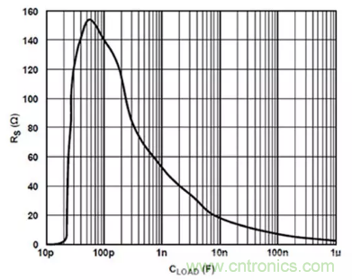 图3:图2中的电路在单位增益、±110V供电电压及VOUT = 100Vp-p时,最大峰值为2dB对应的RS与CLOAD关系曲线图。(图片来源:Analog Devices)