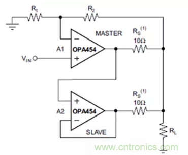 放大器A1用作主放大器,可以进行任何运算放大器配置,而不只是作为基本增益单元。放大器A2是从放大器,可以只有一个,也可以有多个。该放大器配置为单位增益缓冲器,用于在增加额外驱动电流的同时跟踪A1的输出。