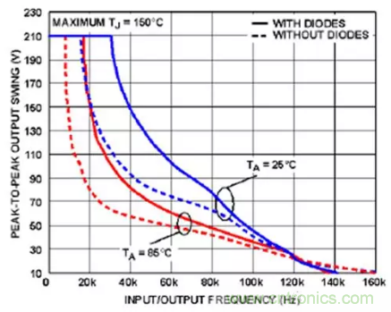 动态SOA也是要关注的方面。ADHV4702-1采用了内部压摆率升压电路来实现19兆赫 (MHz) 小信号带宽和74伏/微秒 (µs) 的压摆率,但这种升压电路可能会消耗大电流,具体取决于信号。为此,使用ADHV4702-1加装外部二极管可限制差分输入电压(图9)。