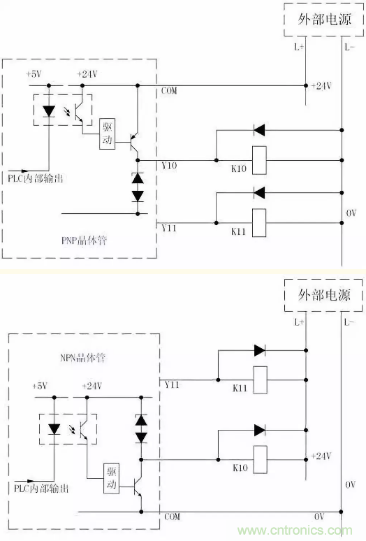由以上两图可看出这两种晶体管输出电路形式的区别:NPN型集电极开路输出形式的公共端COM只能接外接电源的负极,而PNP型的COM端只能接外接电源的正极。