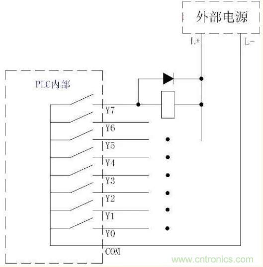 PLC继电器输出电路的形式继电器触点的使用寿命也有限制(一般数十万次左右,根据负载而定,如连接感性负载时的寿命要小于阻性负载)。此外,继电器输出的响应时间也比较慢(10ms)左右,因此,在要求快速响应的场合不适合使用此种类型的电路输出形式(可以根据场合使用下面介绍的两种输出形式)。