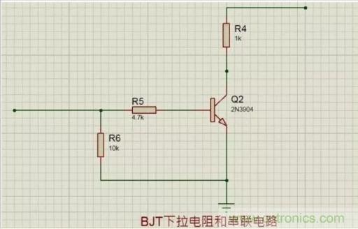 在BJT晶体三极管的基极端,上拉电阻和下拉电阻也起着至关重要的作用。在三极管的电路应用中,串接在基极上的电阻起限制基级电流的作用,如下图中的R2所示,
