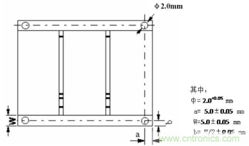 在拼板外框的四角开出四个定位孔,孔径4mm±0.01mm;孔的强度要适中,保证在上下板过程中不会断裂;孔径及位置精度要高,孔壁光滑无毛刺。