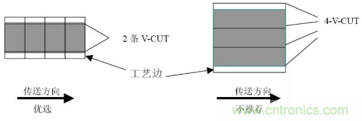 拼板方向应平行传送边方向设计, 当尺寸不能满足上述拼版尺寸要求的例外。一般要求“V-CUT”或邮票孔线数量≤3(对于细长的单板可以例外),见图3.4。