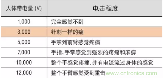 下面介绍了当人体带电时带电量与所感受到的电击之间的大致关系。