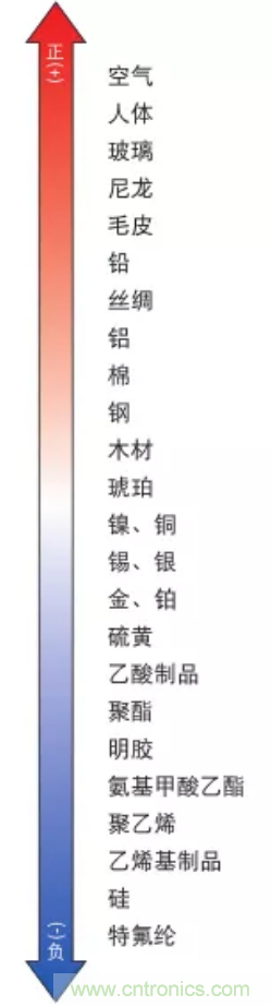 在该“带电序列”中,正方向上的物体带正电而负方向上的物体带负电。此外,随着物体在序列中距离的增加,相互之间摩擦时产生的静电量也会越大。