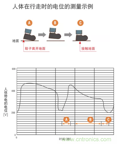 人体中有 80% 以上是水,因此静电很容易流过人体。穿着鞋时,鞋底充当了绝缘体,防止静电流动。这样所产生的静电就会聚集起来,无法释放。下图表明了人在行走时产生的静电量。