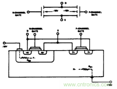 图1是一个典型CMOS输出开关单元的电路图及截面图。从不同单元和区域之间的连接关系中,我们可以画出一个等效二极管电路图(图2)。如果在S端或D端的模拟输人电压超过电源电压。