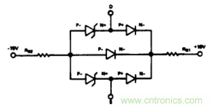 图4举例说明了通过在电源供电引脚串联二极管(比如1N459)防止寄生晶体管导通的方法。如果S端或D端电压高于电源电压时,CR1和/或CR2反向偏置,基极驱动电路不能使晶体管导通。每个CMOS器件都应该有一对独立的二极管对其进行?;?。尽管这个方法很有效,但它不是万无一失的。如果开关的一端连接到一个负电位(例如一个充电电容),并且另一端电压超过VDD,则尽管有?;ざ?。