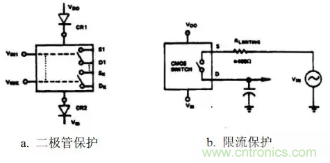 过压能引起过大的电流和金属化问题。通常,运算放大器的输出作为S端或D端的电压源,因此电流不能大于运算放大器直流输出电流的限值。然而,瞬态感应电流仍有可能破坏CMOS器件;因此,有必要进行保护。
