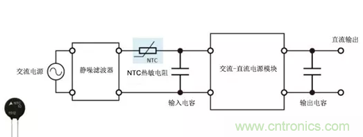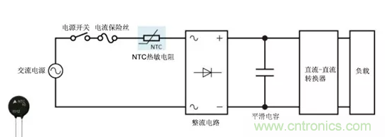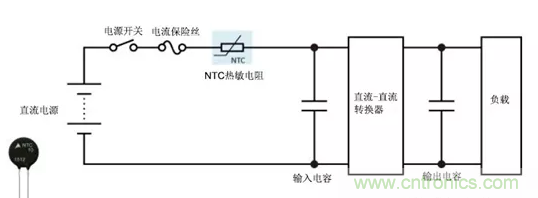 在简单的直流电源电路(例如直流-直流转换器)中,NTC热敏电阻可用作电源热敏电阻并有效地限制冲击电流,而输入和输出电容在电源打开时即可开始充电。NTC热敏电阻在通电后其电阻会大大降低,因此与使用固定电阻相比,其功率损耗更低。