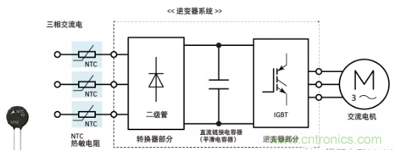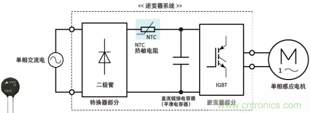 逆变器系统主要由转换器级、逆变器级和直流侧电容(平滑电容)组成,该电容放置在转换器级之后,如下所示。上电时,器件会通过冲击电流进行充电,而该冲击电流的峰值是(为直流侧电容充电的)稳定电流的若干倍。该冲击电流可能会对直流电容的使用寿命产生不利影响,或损坏半导体器件。为了防止冲击电流,我们需要连接NTC热敏电阻。