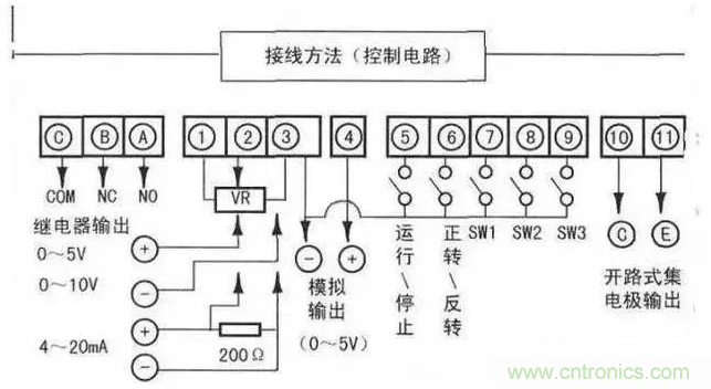 2、由于控制电路的频率输入信号是微小电流,所以在接点输入的场合,为了防止接触不良,微小信号接点应使用两个并联的节点或使用双生接点。