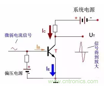 微弱变化的电信号通过三极管放大成波幅度很大的电信号,如下图所示: