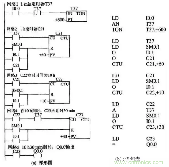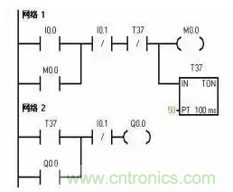 2.延时停止控制 定时时间到,延时停止。I0.0为启动按钮、I0.1为停止按钮。
