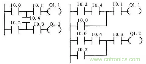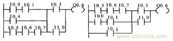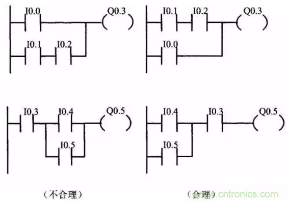 (3)几个串联支路相并联,应将触点多的支路安排在上面;几个并联回路的串联,应将并联支路数多的安排在左面。按此规则编制的梯形图可减少用户程序步数,缩短程序扫描时间。