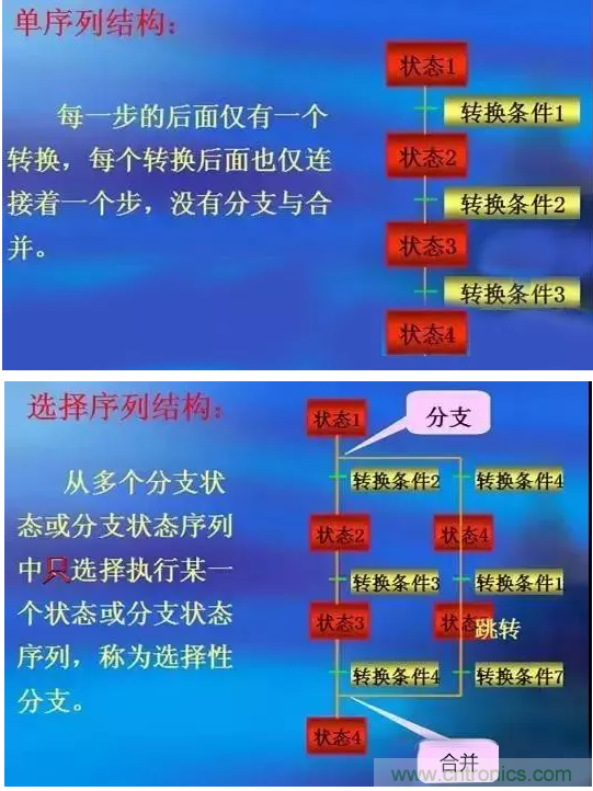 功能表图的基本结构:单序列结构、选择序列结构、合并序列结构