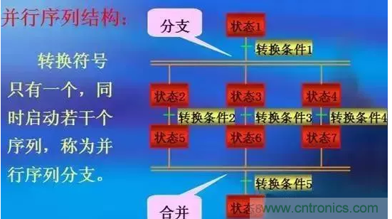 并行序列的结束称为合并。转换符号在水平线以下,当双水平线之上的所有前级都处于活动状态时,且转换条件成立,则下一步被激活。同时所有前级步都变为不活动步。