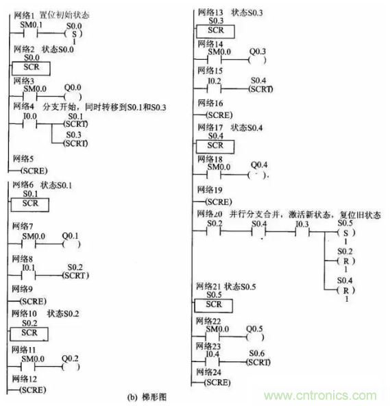 (6)在状态发生转移后,所有的SCR段的元器件一般也要复位。如果希望继续输出,可使用置位/复位指令。