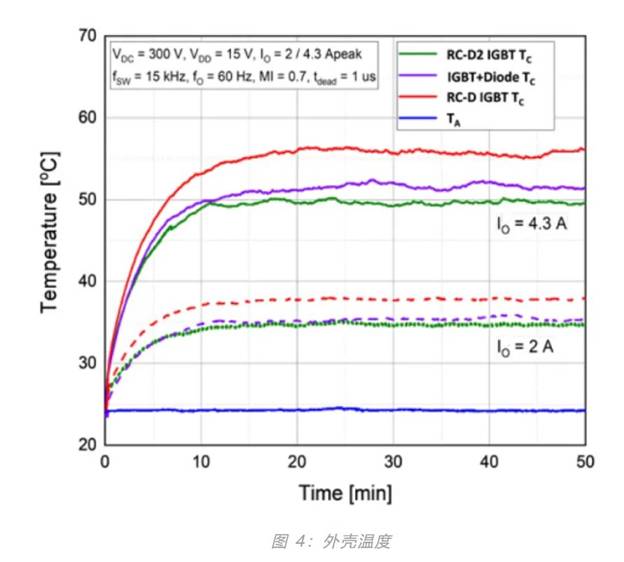 利用三相变频系统,对IM523的热性能进行了评估。将它与使用上一代RC-IGBT技术和传统IGBT及二极管的模块进行了比较。为了评价每个解决方案的热性能,测量了各个模块在实际工作条件下的外壳温度。测量结果如图4所示。