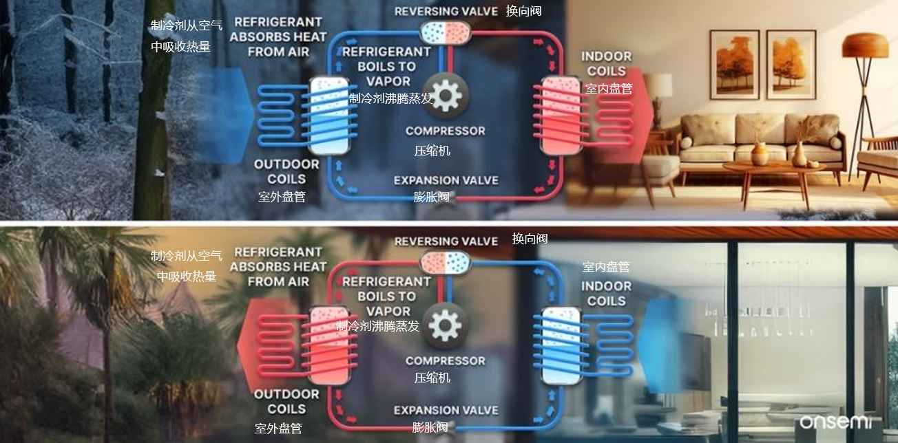 热泵是一种用于制冷和供暖的多功能、高能效技术。热泵可以通过换向阀改变制冷剂的流动方向,从而实现供暖或制冷。在此过程中,空气通过蒸发器盘管,促进热能从空气转移到制冷剂。热能在制冷剂中循环,然后通过冷凝器盘管释放出来,同时风扇将空气吹过盘管。在此过程中,热能从一个位置传递到另一个位置,如下图 1 所示。随着我们努力实现未来无碳排放,具有高效电机控制能力的功率半导体需求量很大。在提高效率的同时减小系统的整体尺寸和成本至关重要。